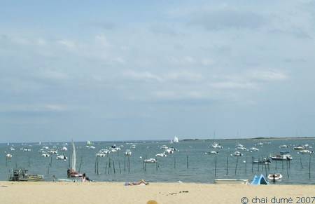 Là-bas au loin, toute petite sur la fôto mais tellement enchanteresse se trouve l’île aux oiseaux en plein milieu du bassin d’Arcachon et ses cabanes tchanquées ; c’est vrai çà, on a vraiment l’impression qu’elles sont montées sur échasses (tchanques en gascon) ; territoire secret et quasi- magique où la vie de Robinson prend son véritable sens ; 2 jours à attraper des crabes, économiser l’eau douce, ramasser des palourdes et des coques, cueillir des huîtres et…. cuisiner ;