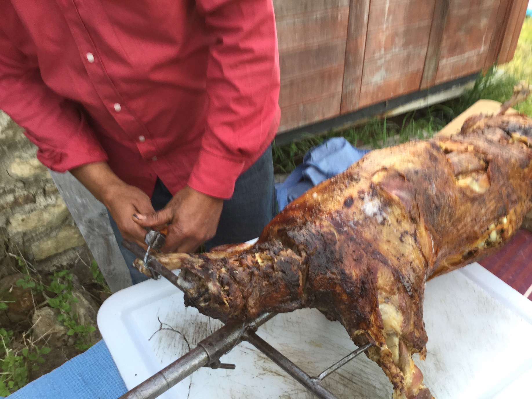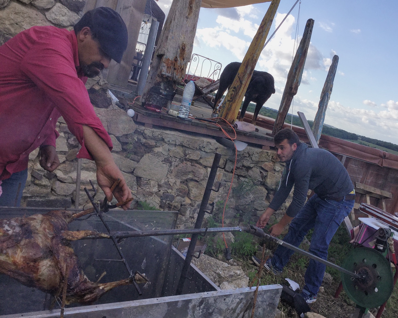 L’animal est donc placé à une trentaine de cm de la braise puis tourné sur la broche longuement et régulièrement pour qu’il cuise ; la braise est rajoutée au fur et à mesure ;