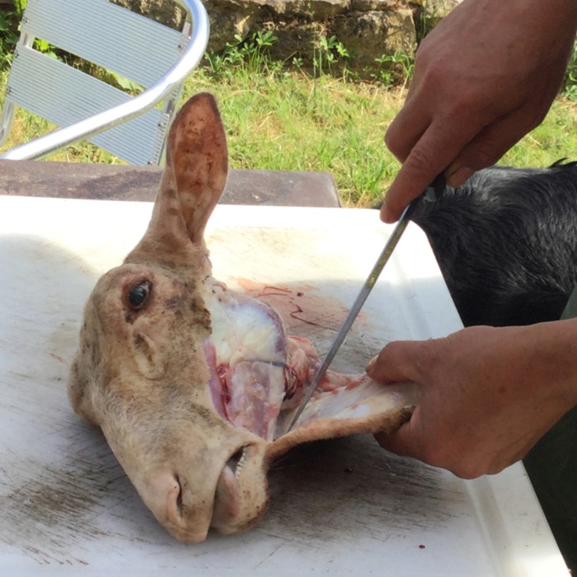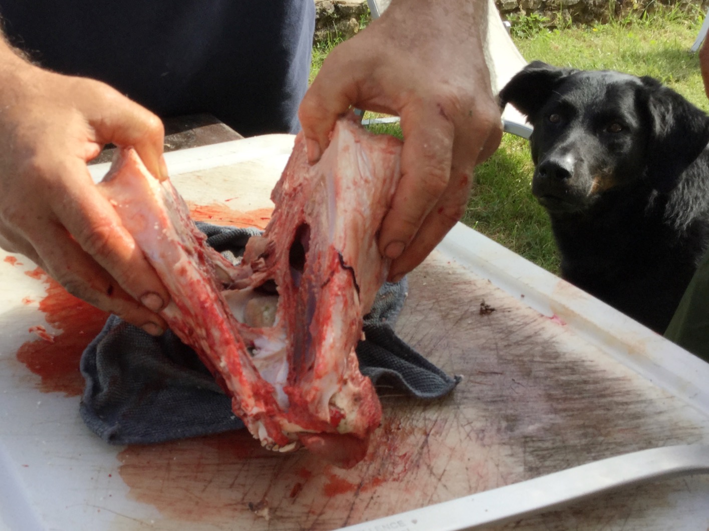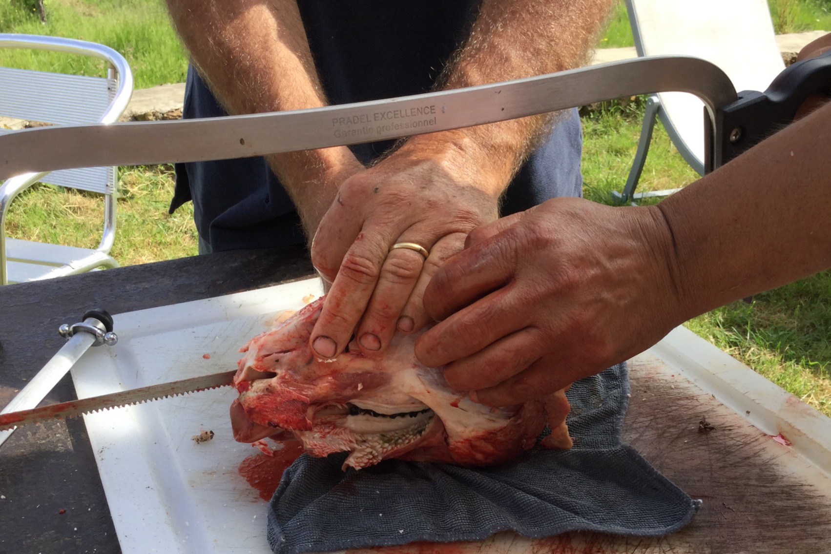 Après avoir égorgé et dépecé, le broutard a été vidé puis longuement rincé à l’eau claire ;