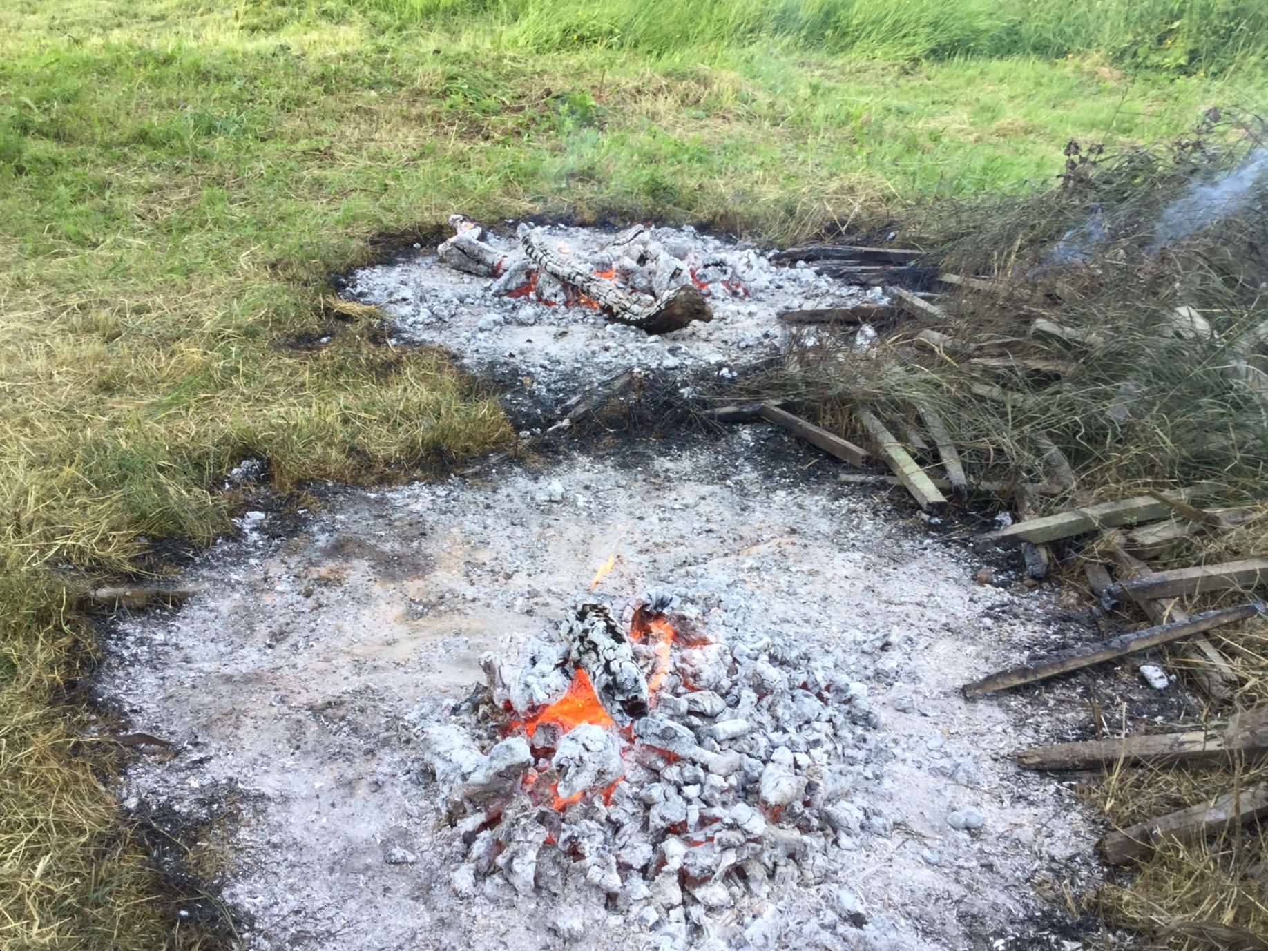 En début d’après-midi, après avoir longuement débattu du lieu de cuisson ( abrité du vent, d’un éventuel grain, proche de la réserve de bois, sur un sol plan….. ) le feu a démarré… et la bestiole embrochée sur une barre de fer et maintenu par du fil de fer après avoir été cousu du cou jusqu’à la queue pour éviter qu’il ne se dessèche !